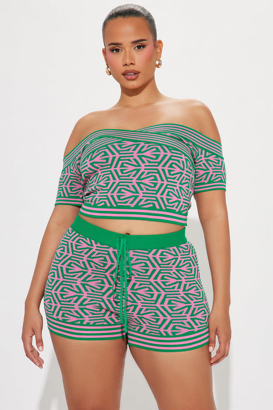 Angelina Green Sweater Off Shoulder Cropped Short Set